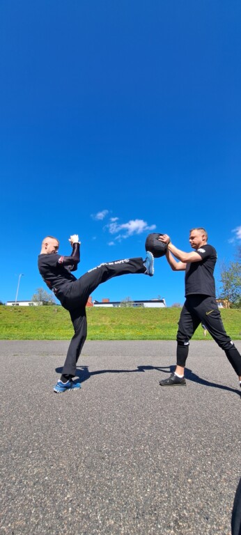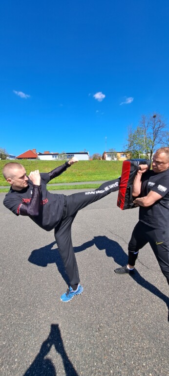 Spodnie są specjalnie szyte dla naszej Sekcji 😉 pod kątem treningów walki wręcz. Spodnie są wytrzymałego materiału, z haftowanym zapisem Krav Maga- Be Safe na całą długość nogawki. Specjalny krój spodni pozwala bez problemowo wykonywać wszelkie kopnięcia i nie ogranicza żadnych ruchów.