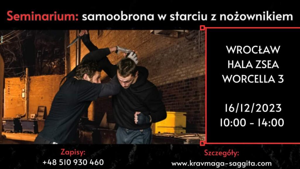 Seminarium „SAMOOBRONA W STARCIU Z NOŻOWNIKIEM” to intensywny kurs najskuteczniejszych technik krav maga przeciwko napastnikowi uzbrojonemu w nóż. Szkolenie idealne dla początkujących kursantów, ale też dla zaawansowanych kraverów!